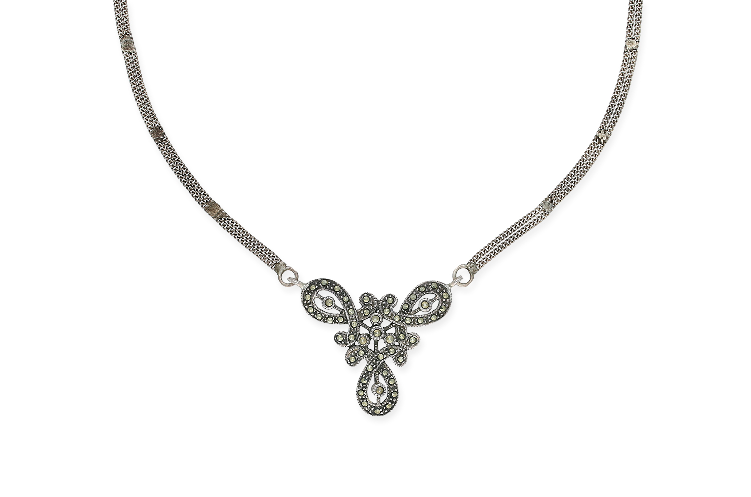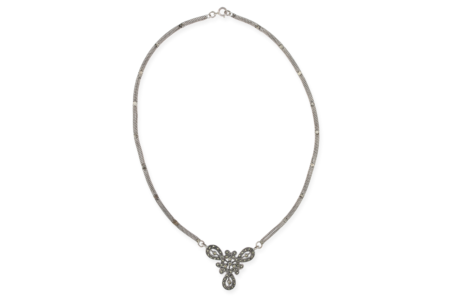 Das antike Collier aus 925er Silber zeigt ein feingliedriges, ornamentales Mittelteil, das vollständig mit funkelndem Markasit besetzt ist und dadurch seinen typisch eleganten, leicht geheimnisvollen Glanz erhält. Die zarte, doppelt gearbeitete Silberkette greift die filigrane Gestaltung harmonisch auf und verleiht dem Collier eine leichte, geschmeidige Wirkung am Hals. Durch die kunstvolle Kombination aus geschwärztem Silber und den silbrig schimmernden Markasit-Steinen wirkt das Stück besonders stilvoll und erinnert an die edlen Schmuckkreationen des frühen 20. Jahrhunderts.
