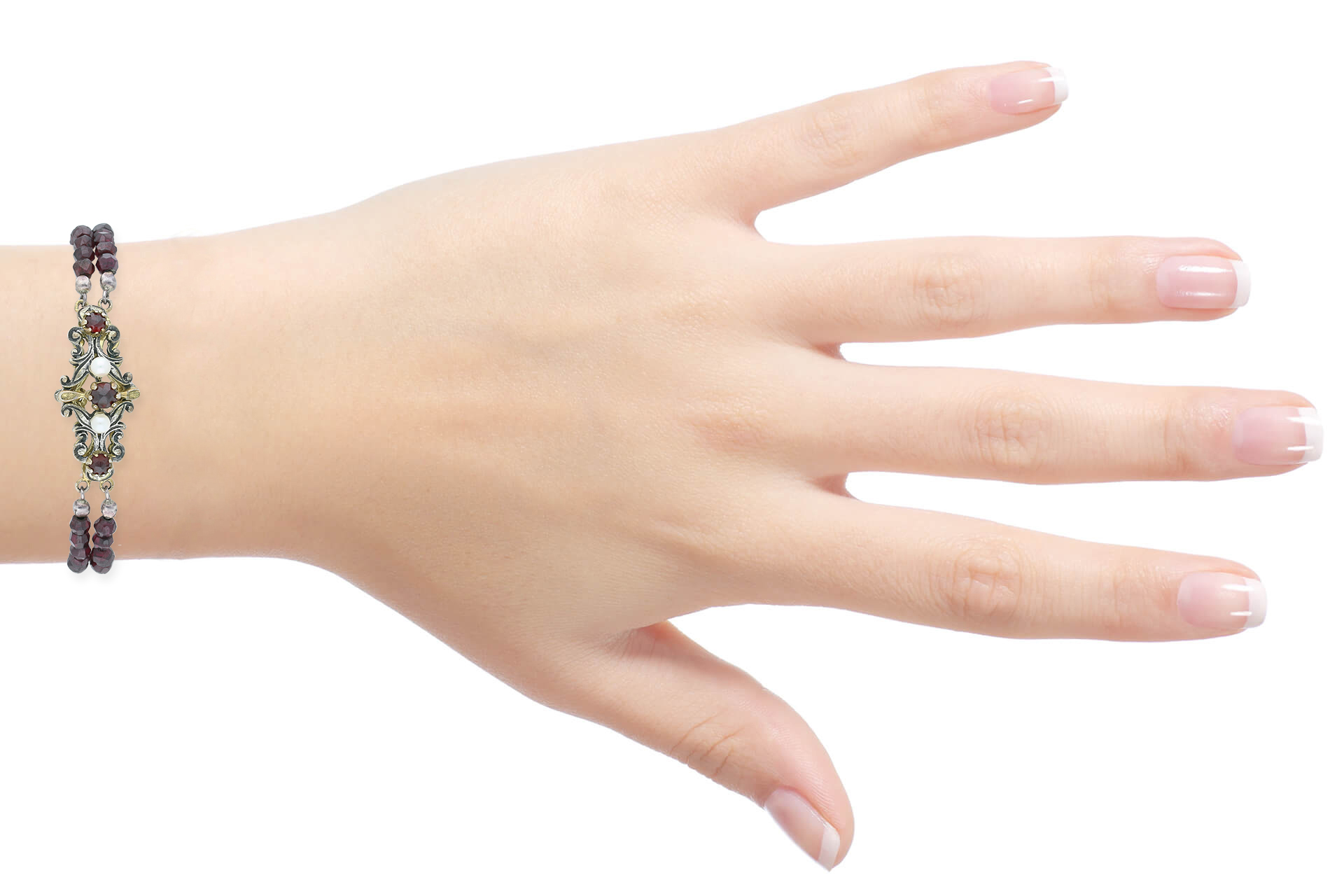 Ein elegantes Armband aus 835er Silber, das durch seine zweireihige Gestaltung mit facettierten Granatperlen sofort ins Auge fällt. Die dekorative Mittelsektion kombiniert tiefrote Granate mit zarten Zuchtperlen, wodurch ein harmonisches Zusammenspiel aus Farbe und Struktur entsteht. Feine, ornamental verzierte Silberelemente mit vergoldeten Akzenten verleihen dem Schmuckstück eine anspruchsvolle, leicht historisierende Anmutung und machen es zu einem edlen Begleiter für besondere Anlässe.