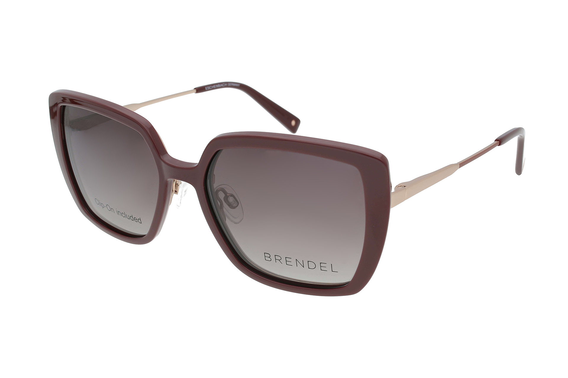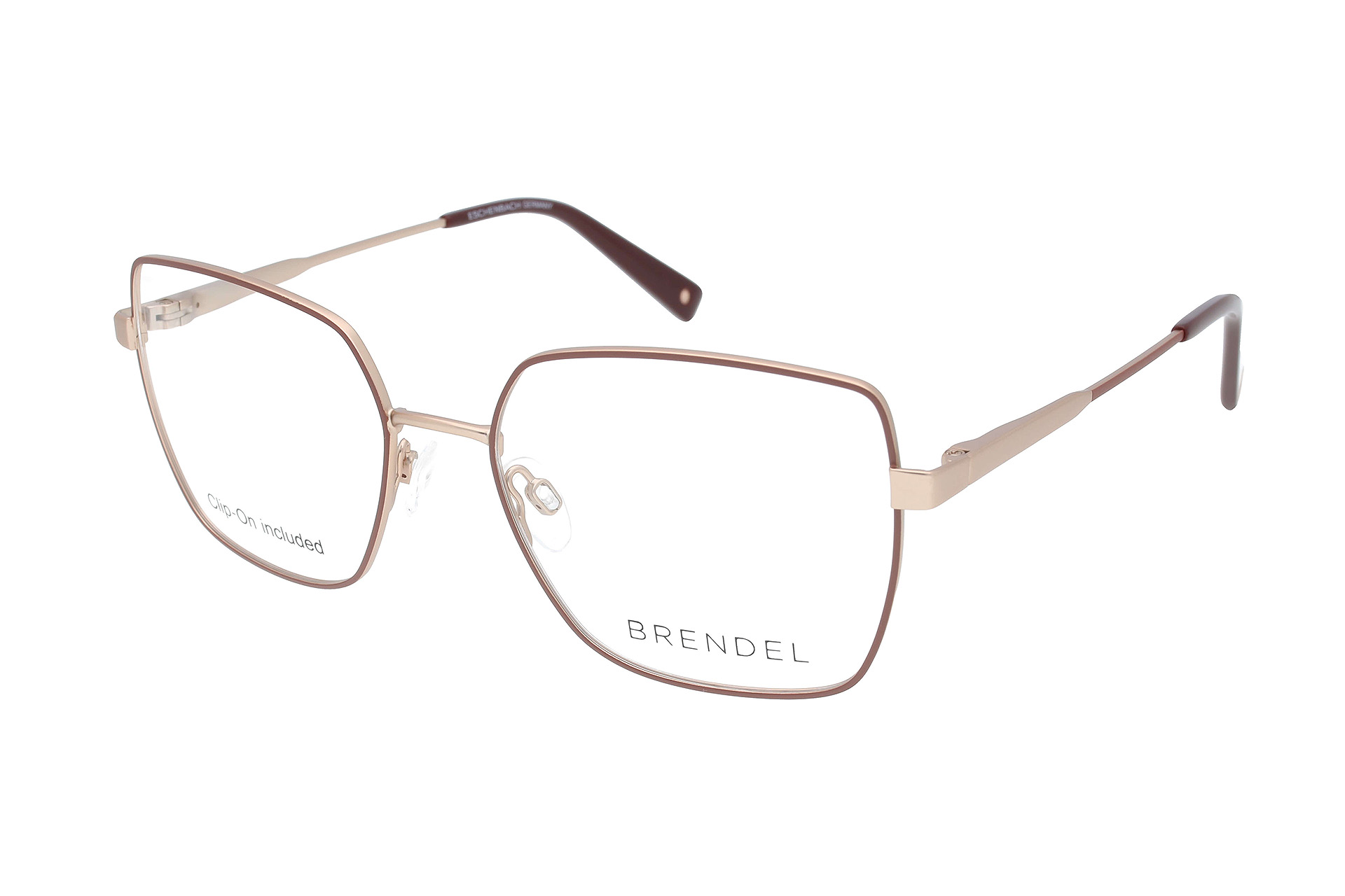 Goldfarbene, quadratische Edelstahl-Brille mit braunem Rahmen von Brendel. Inklusive aufsteckbarem, braunen Magnet-Sonnenclip mit Verlaufsgläsern aus Kunststoff.