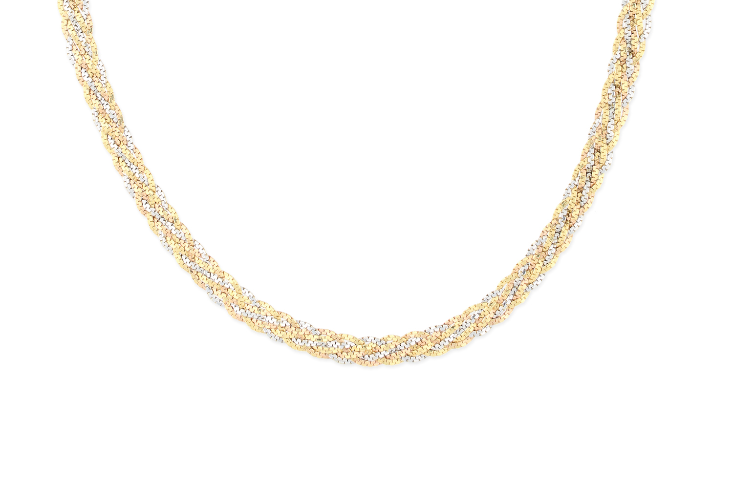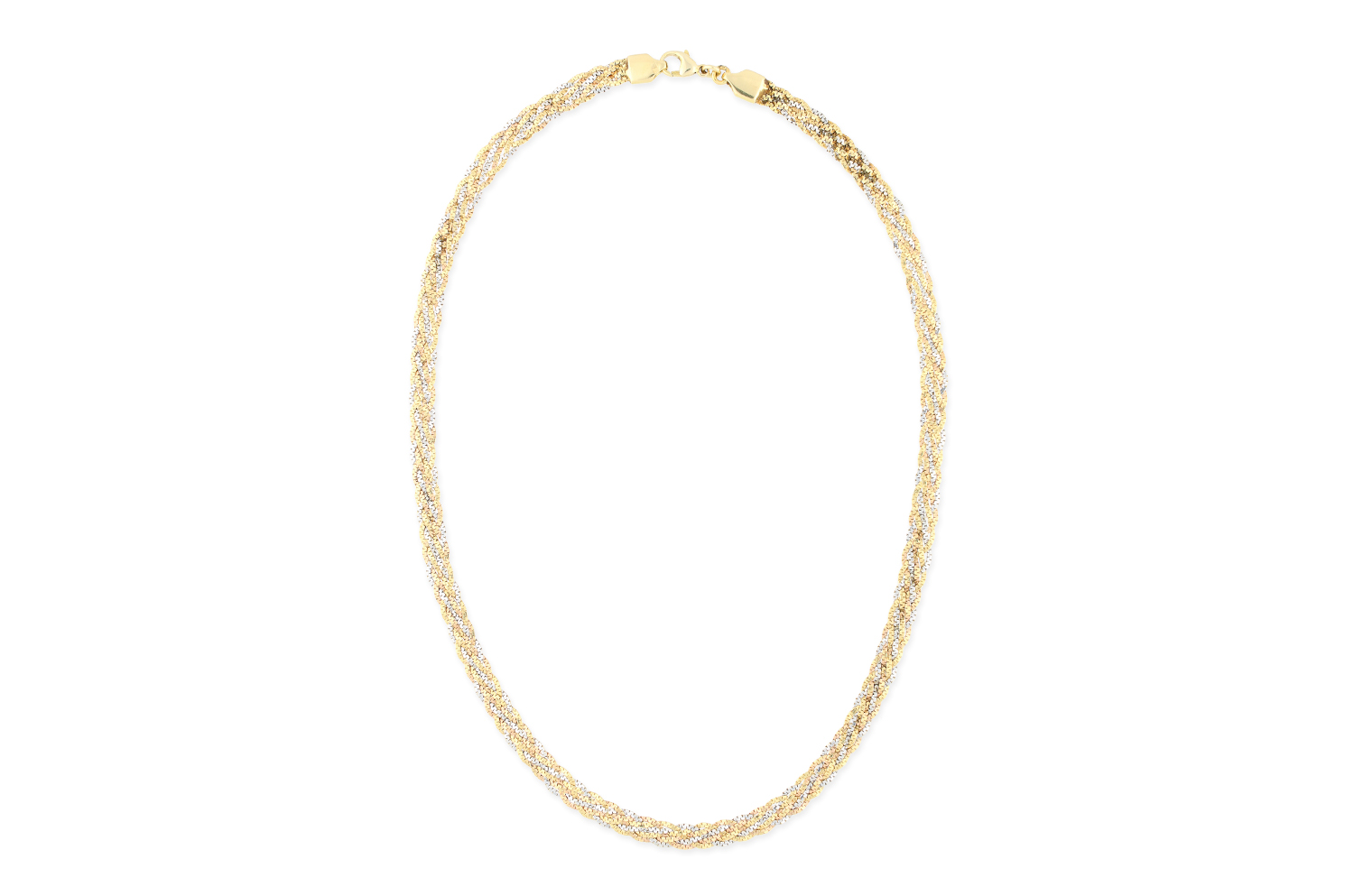Dieses elegante Collier aus 750er Weiß- und Gelbgold besticht durch seine kunstvoll verflochtene, mehrreihige Gestaltung in Bicolor-Optik. Die feinen, ineinander gedrehten Stränge erzeugen ein lebendiges Lichtspiel und verleihen dem Schmuckstück eine besonders luxuriöse Ausstrahlung. Durch das harmonische Zusammenspiel von warmem Goldton und kühlem Weißgold wirkt das Collier zugleich klassisch und modern. Ein stilvoller Halsschmuck für besondere Anlässe oder als edler Blickfang im Alltag – ideal für die elegante Frau mit Sinn für zeitlose Schönheit.