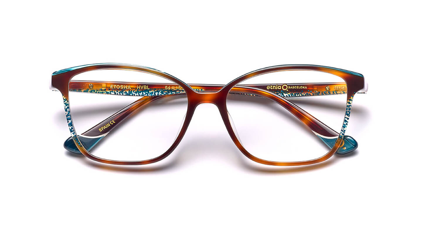 Damenbrille ETOSHA von Etnia Barcelona aus braun meliertem Premium-Acetat. Die blauen Farbakzente innerhalb des halbtransparenten Acetats sorgen für einen besonderen Look.