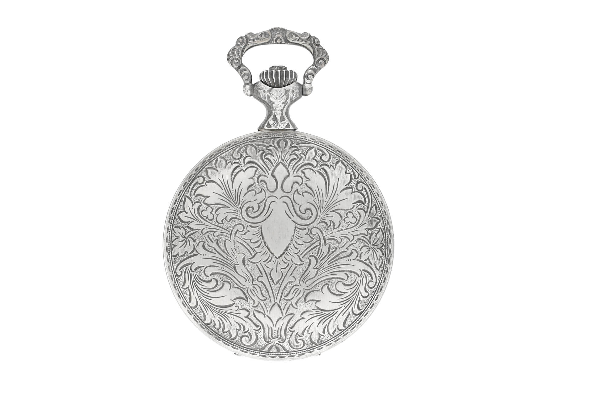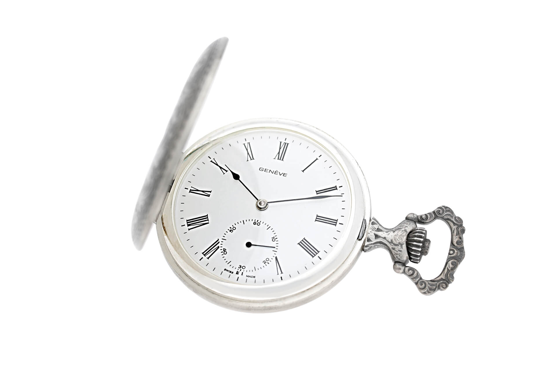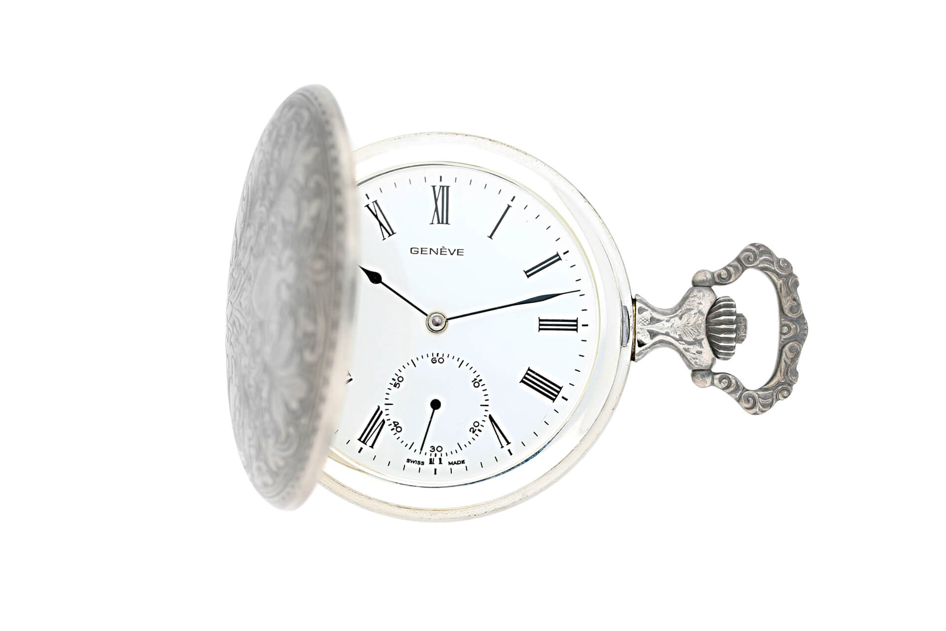 Diese fein gearbeitete, gebrauchte Schweizer Geneve Taschenuhr verbindet traditionelle Uhrmacherkunst mit einer besonders dekorativen Optik. Das silberfarbene Gehäuse ist auf Deckel und Boden reich mit floralen Ornamenten graviert und macht die Uhr zu einem echten Blickfang – ob in der Westentasche, an der Kette getragen oder als stilvolles Sammlerstück.