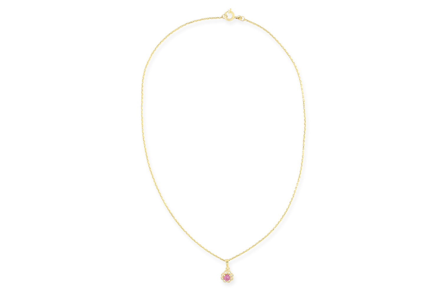 Eine zarte Halskette aus 585er Gold mit einem fein gearbeiteten Anhänger, der einen leuchtend roten Rubin in den Mittelpunkt stellt. Umrahmt wird der Rubin von funkelnden synthetischen Steinen, die dem Schmuckstück eine elegante, zeitlose Ausstrahlung verleihen. Das filigrane Design macht diese kurze Kette zu einem stilvollen Begleiter für Alltag und besondere Anlässe.