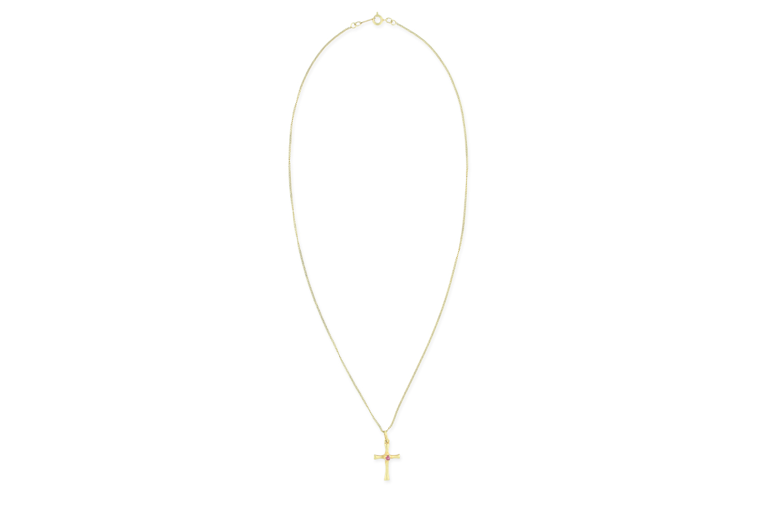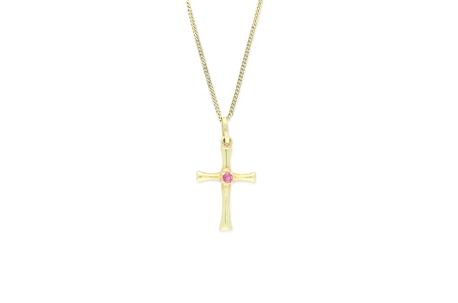 Elegante Kette mit Anhänger aus 333er Gold besticht durch ihre feine, klassische Gliederung und einen stilvollen Kreuzanhänger. Im Mittelpunkt des Kreuzes sitzt ein leuchtender Rubin, der dem Schmuckstück eine warme, edle Farbnote verleiht und einen dezenten Blickfang schafft. Die harmonische Kombination aus zarter Kette und ausdrucksstarkem Anhänger macht dieses Schmuckstück vielseitig tragbar – sowohl im Alltag als auch zu besonderen Anlässen.