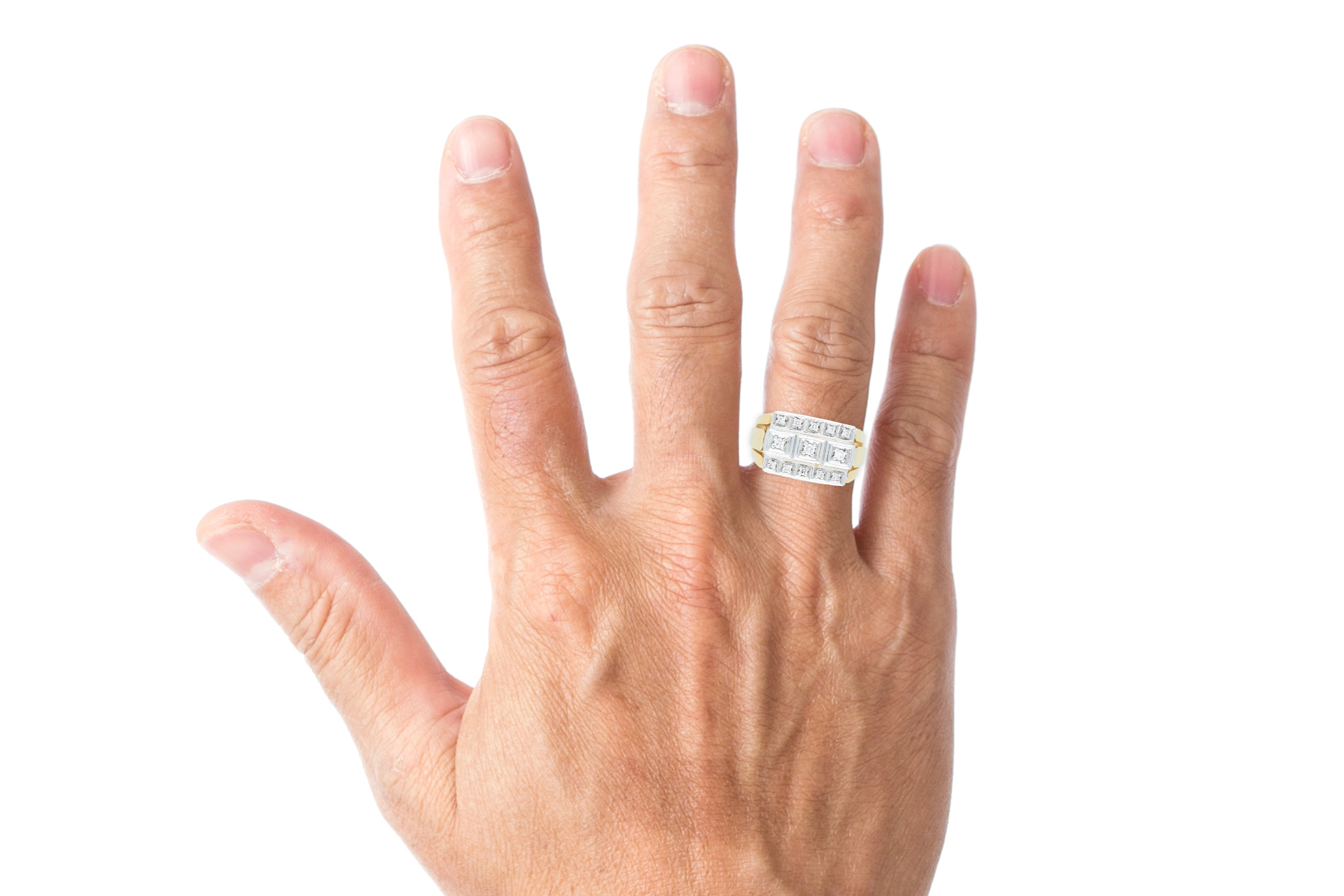 Dieser Herrenring aus 585er Weiß- und Gelbgold beeindruckt durch seine markante Bicolor-Optik und den edlen Brillantschmuck. In der rechteckigen Kopfpartie sind mehrere Brillanten in kleinen Quadratfassungen angeordnet, sodass ein lebendiges Funkeln entsteht. Die solide, leicht gesplittete Ringschiene sorgt für angenehmen Tragekomfort und unterstreicht den selbstbewussten Charakter dieses Schmuckstücks – ideal für Männer, die ein ausdrucksstarkes, hochwertiges Accessoire suchen.