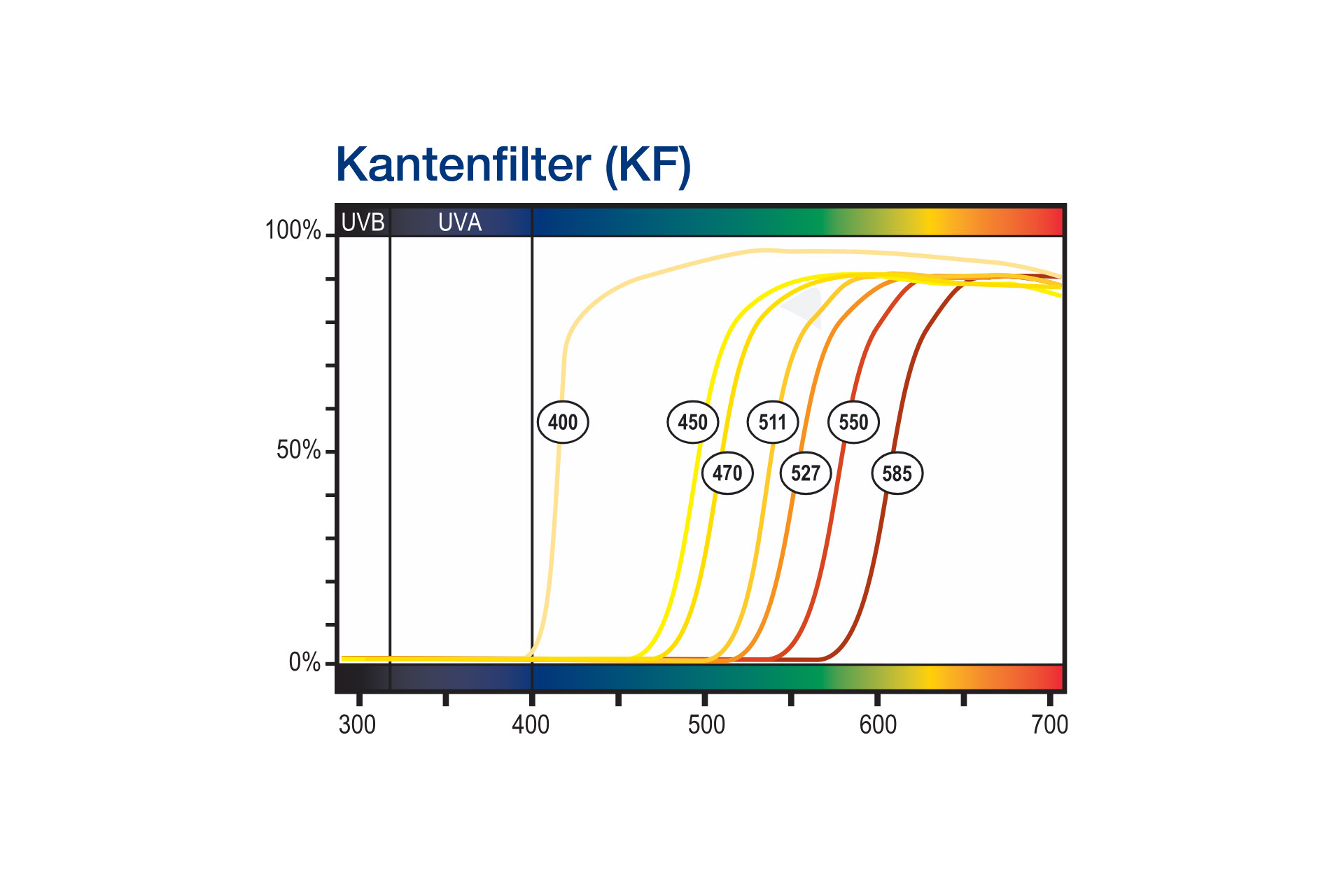 Spezialfiltergläser mit einer blockenden Wirkung bestimmter Lichtbereiche von natürlichen und künstlichen Lichtquellen. Höchster Schutz vor kurzwelligem Licht und zur maximalen Kontraststeigerung, bei überwiegend medizinischen Anwendungen. Die Filtergläser absorbieren die Wellenlängen des Lichts mit hoher Energieintensität, jeweils bis zur angegeben Zahl. KF 400 Gläser filtern z.B. alle Wellenlängen bis 400 nm, die KF 585 Gläser das gesamte Lichtspektrum bis 585 nm.