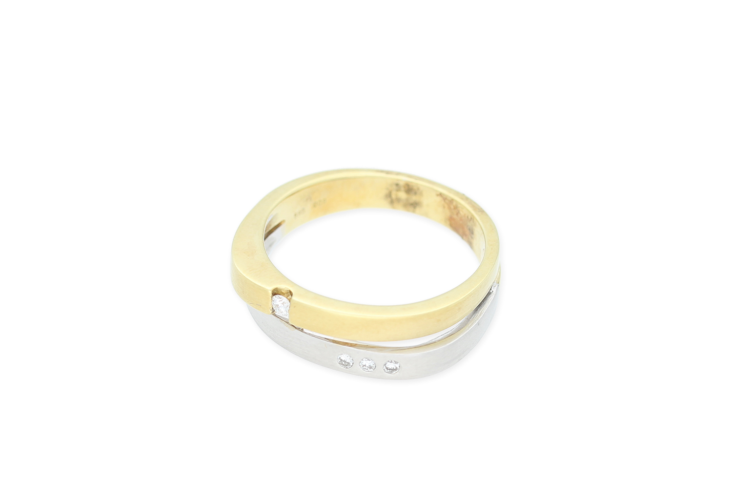 Modern-eleganter Ring aus 585er Weiß- und Gelbgold überzeugt durch sein spannendes Zusammenspiel zweier unterschiedlich gestalteter Ringschienen. Die warme Goldfarbe trifft auf kühles Weißgold und schafft so einen stilvollen Kontrast mit besonderem Charakter. Mehrere funkelnde Brillanten setzen feine Lichtakzente und verleihen dem Design zusätzliche Raffinesse. Ein ausdrucksstarkes Schmuckstück – ideal für die Frau, die modernes Design und dezente Eleganz liebt.