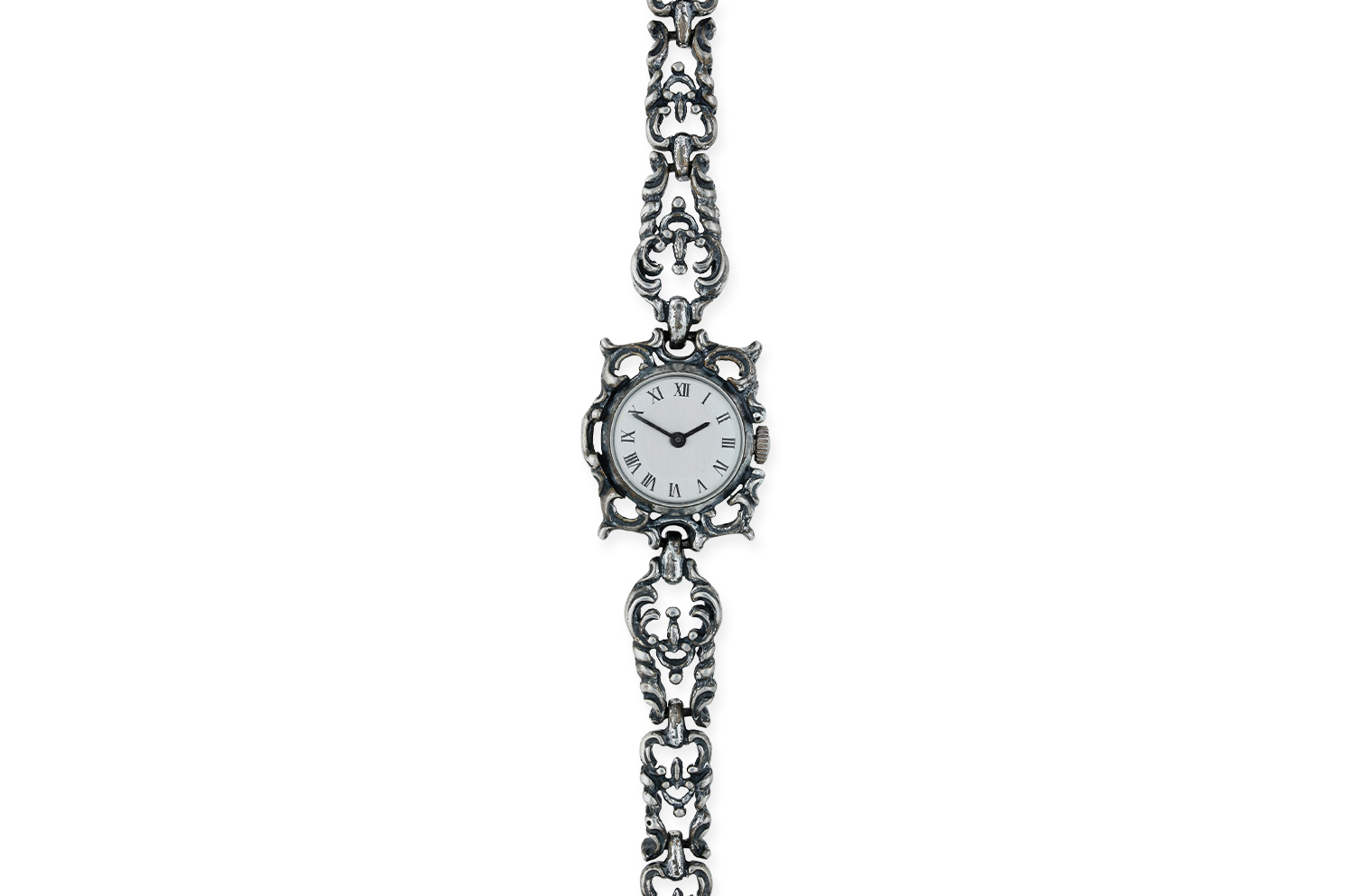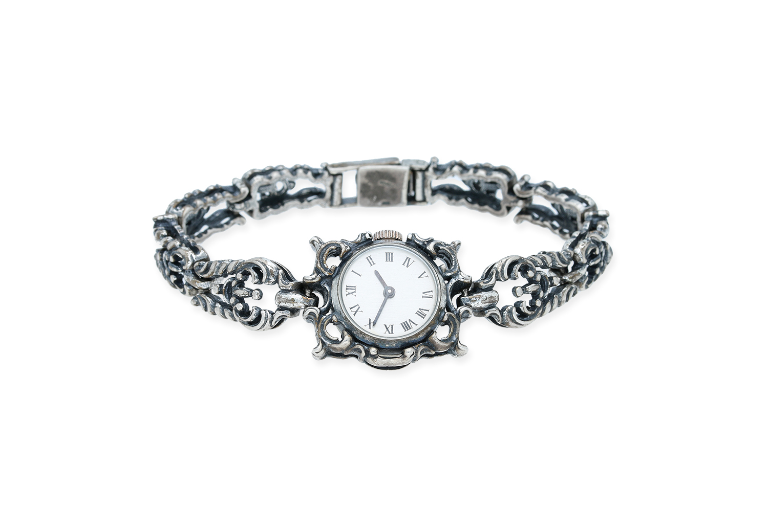 Zierliche Trachten Armbanduhr aus 835er Silber mit kunstvoll gearbeitetem Armband im traditionellen Filigran-Design. Das weiße Zifferblatt bildet einen eleganten Kontrast zum dunklen Silberton. Ein stilvolles Schmuckstück mit funktionaler Uhr – klassisch, charmant und detailreich gestaltet.