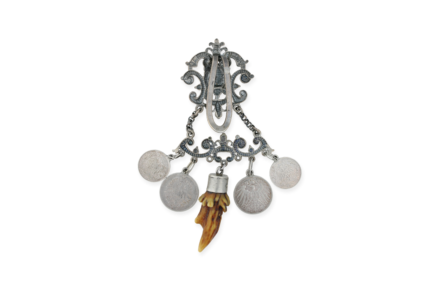 Im traditionellen Trachtenstil präsentiert sich dieses Schürzen-Charivari aus 835er Silber mit mehreren alten Münzanhängern und einem Hirschzahn als zentralem Blickfang. Die reich ornamentierte, geschwärzte Silberarbeit verleiht dem Stück eine authentische, antike Ausstrahlung und macht es zum idealen Schmuckstück für Lederhose, Janker oder Tracht – perfekt für alle, die individuelle Accessoires mit Geschichte schätzen.