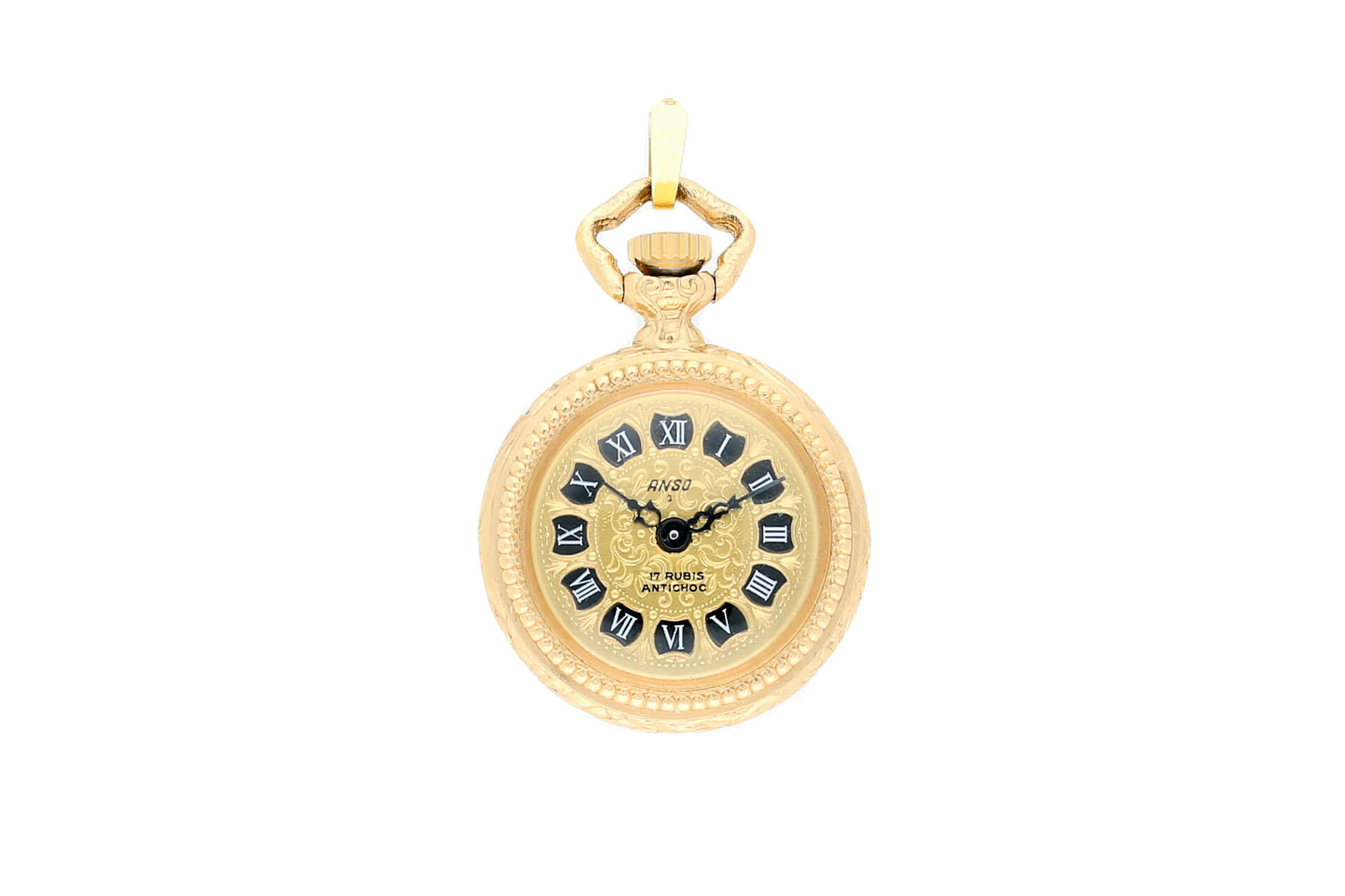 Diese kleine, vergoldete ANSO Taschenuhr besticht durch ihre dekorative Gestaltung und ihre liebevollen Details. Das 25mm breite Gehäuse ist rundum reich verziert, die Rückseite trägt ein feines florales Muster – perfekt für alle, die klassisches Design und nostalgischen Schmuck schätzen.