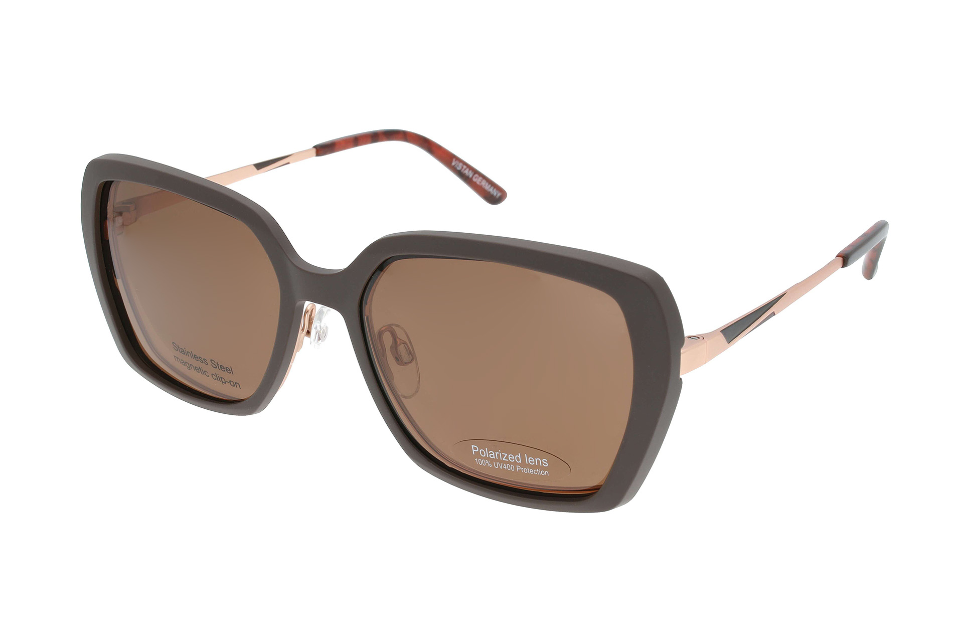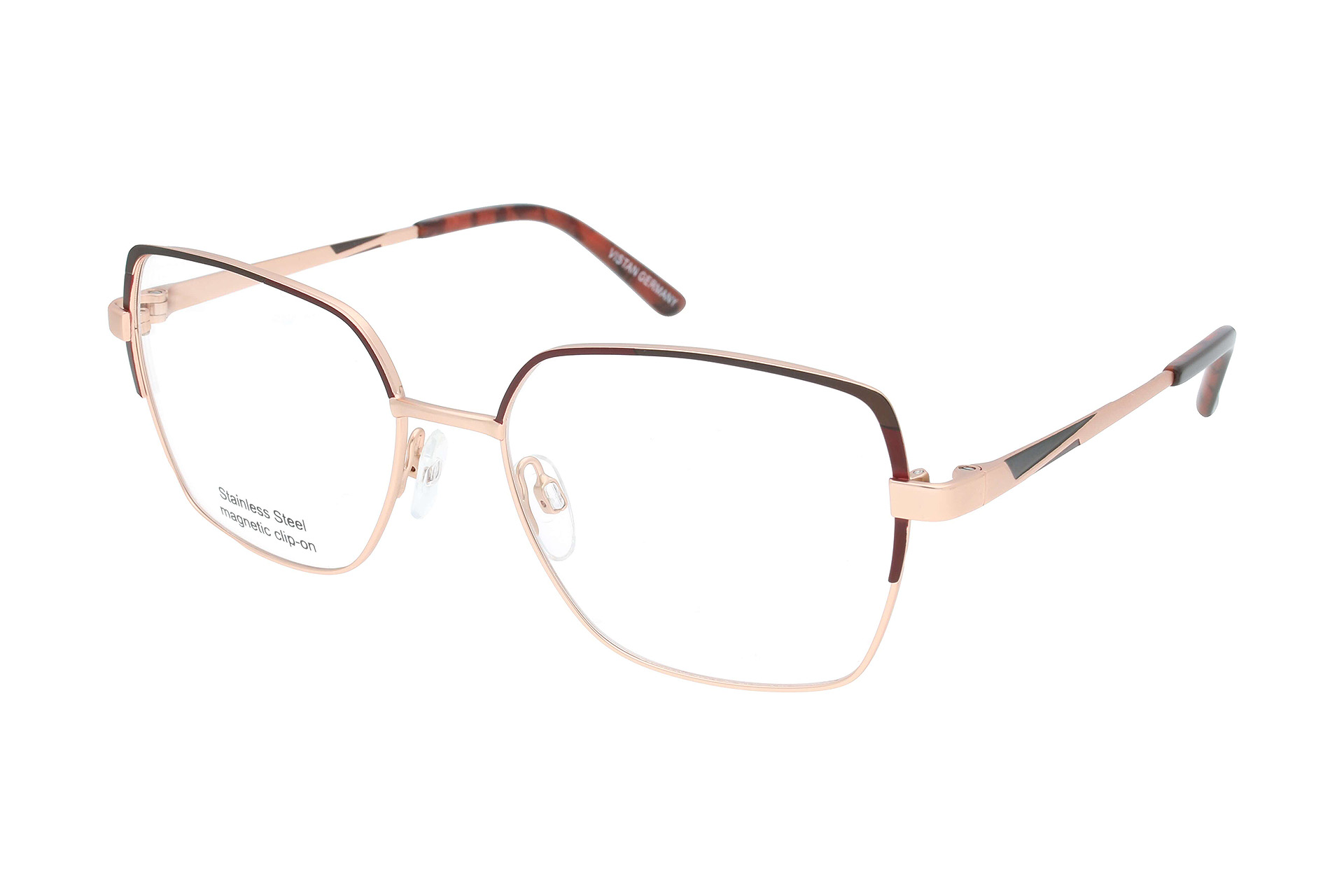 Rotgoldfarbene, quadratische Edelstahl-Brille von VISTAN. Inklusive aufsteckbarem, braunen Sonnenclip aus Kunststoff.